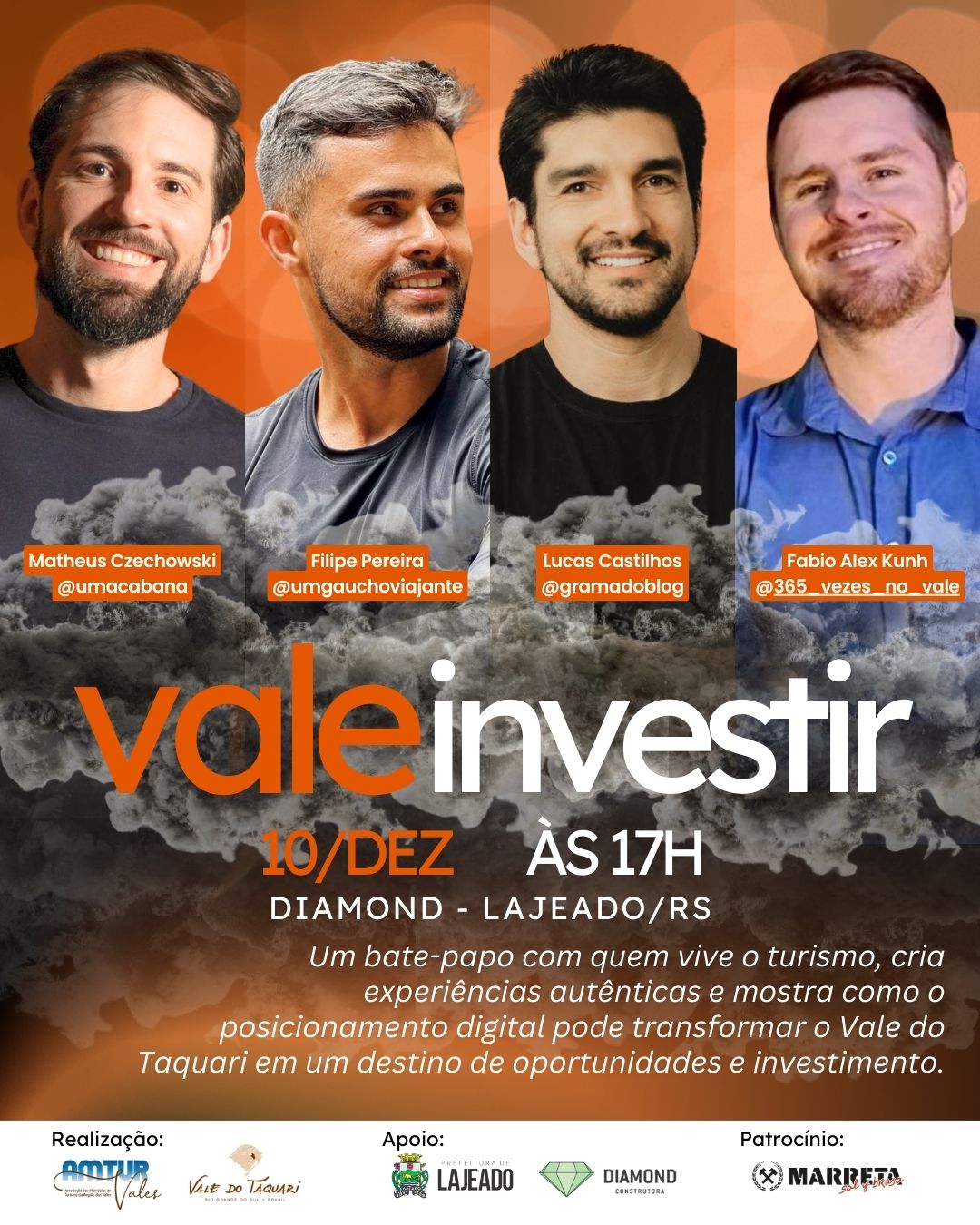 O Vale do Taquari recebe nesta quarta-feira, 10 de dezembro, o Vale Investir, evento que reunirá influenciadores, criadores de conteúdo, empreendedores e profissionais do turismo para discutir o impacto do posicionamento digital e da comunicação assertiva na promoção de destinos turísticos. A atividade será realizada no Diamond, em Lajeado, a partir das 17h, com participação gratuita mediante inscrição. As vagas são limitadas e estão quase esgotadas.